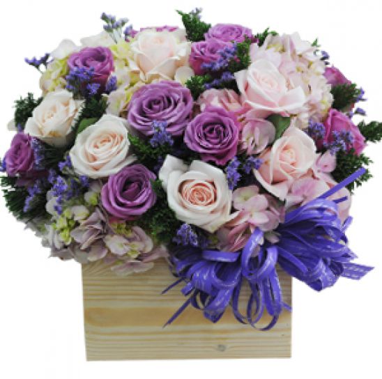 Phù hợp với khách hàng cắm hoa trưng để bàn, bên cạnh sự mềm mại của hoa, là góc cạnh, cứng cáp của hộp gỗ.